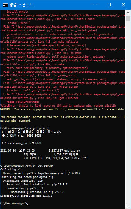 Moving to c:\users\woogyun\appdata\roaming\python\python38\scripts\pip.exe