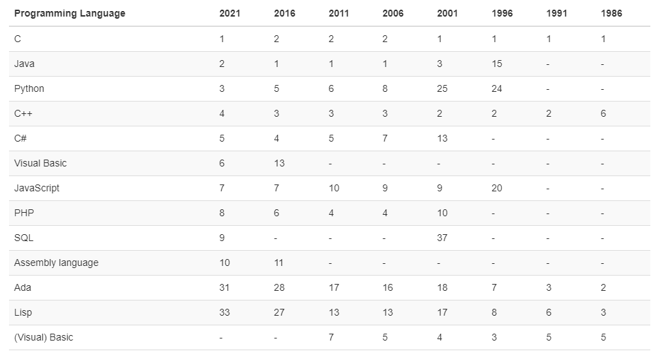 장기간 순위를 보면 C/C++와 Java의 영향력이 독보적이다. 아직 대세는 C 언어 그룹임을 알 수 있다. 배우기 쉬운 BASIC도 아직 큰 영향을 주고 있음을 보니 반갑다.